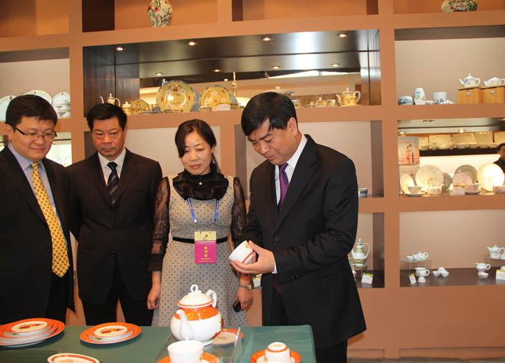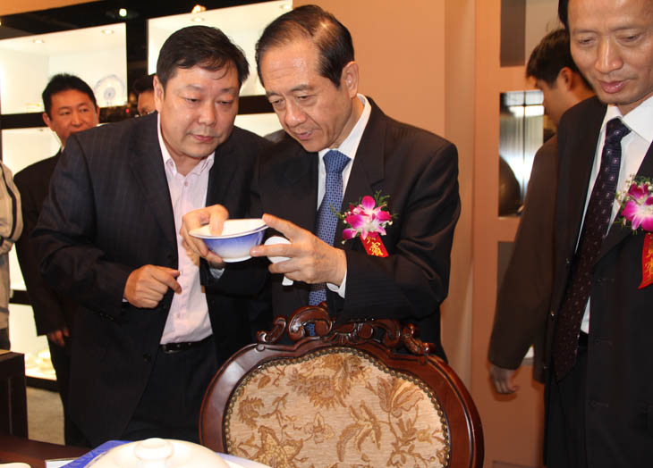 全國人大常委會副委員長韓啟德在我公司展館參觀,對我公司在全國青花玲瓏及青花日用陶瓷器形與裝飾設(shè)計(jì)大賽金獎作品《憶漢》非常感興趣