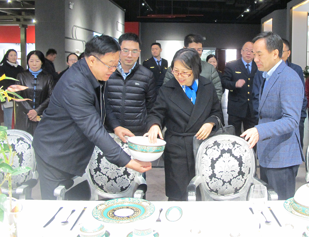 在國瓷館參觀考察期間,周敏建向調(diào)研組一行簡要介紹了集團(tuán)公司發(fā)展歷程。大家邊走邊看,不時(shí)駐足拿起產(chǎn)品仔細(xì)品鑒或拍照。周敏建在介紹“國瓷紅葉”產(chǎn)品特色時(shí)詳細(xì)講解了陶瓷生產(chǎn)工藝,講述了一套套有關(guān)“國瓷”的故事。