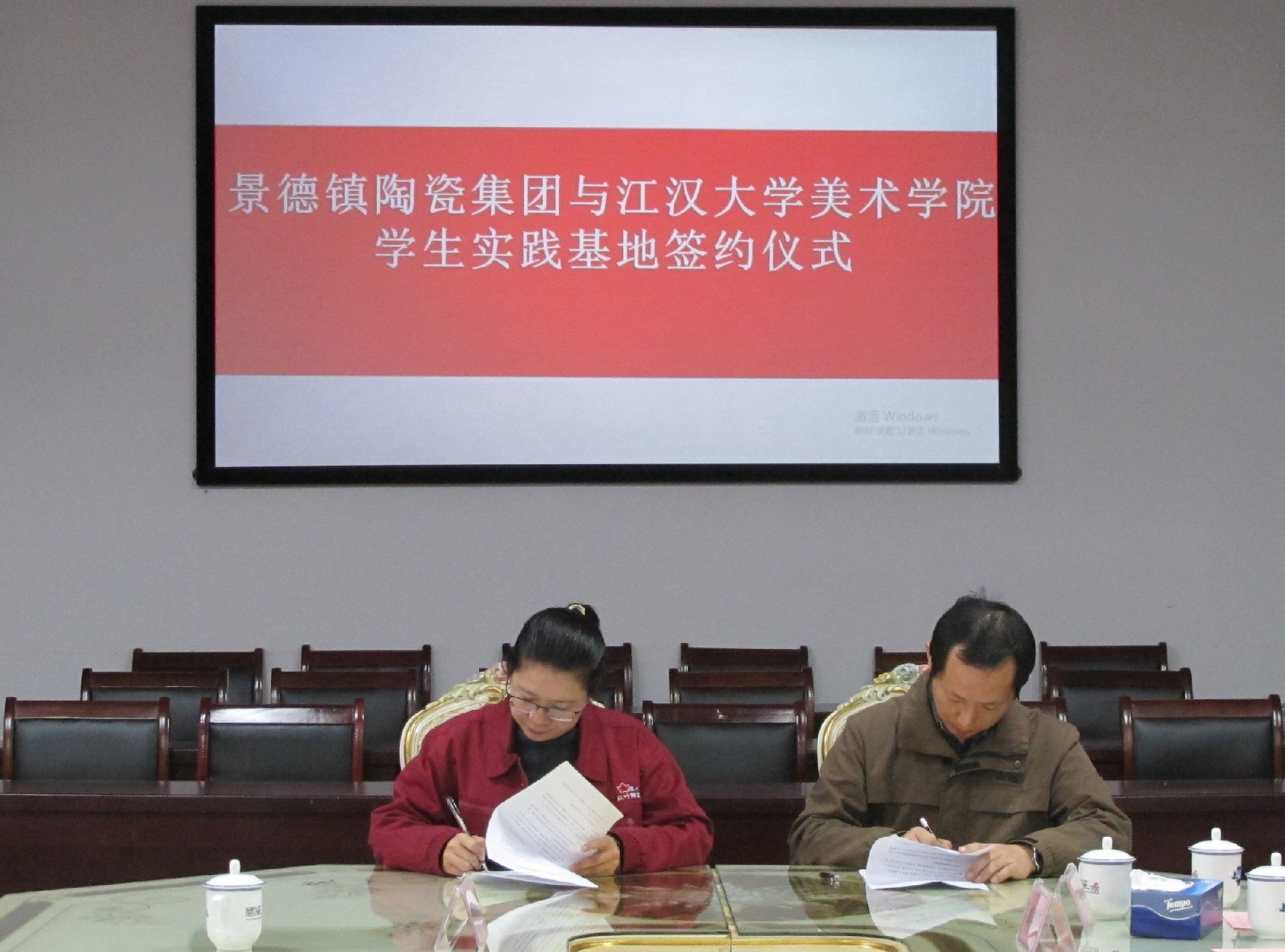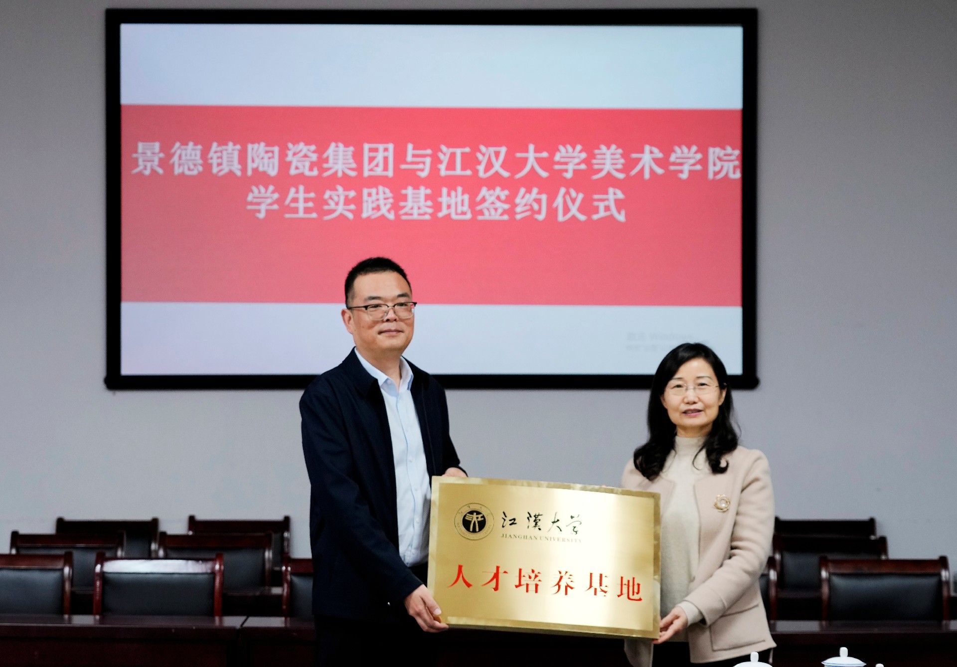 會上,舉行了江漢大學(xué)美術(shù)學(xué)院與景陶集團(tuán)“共建學(xué)生實踐基地”簽約授牌儀式。集團(tuán)人力資源部部長薛景玉、江漢大學(xué)美術(shù)學(xué)院副院長馬杰分別代表雙方初步簽訂了《校外實習(xí)基地建設(shè)協(xié)議書》,江漢大學(xué)美術(shù)學(xué)院副書記楊緒軍代表江大美院捐贈《江漢大學(xué)美術(shù)學(xué)院畢業(yè)作品集》等書籍。